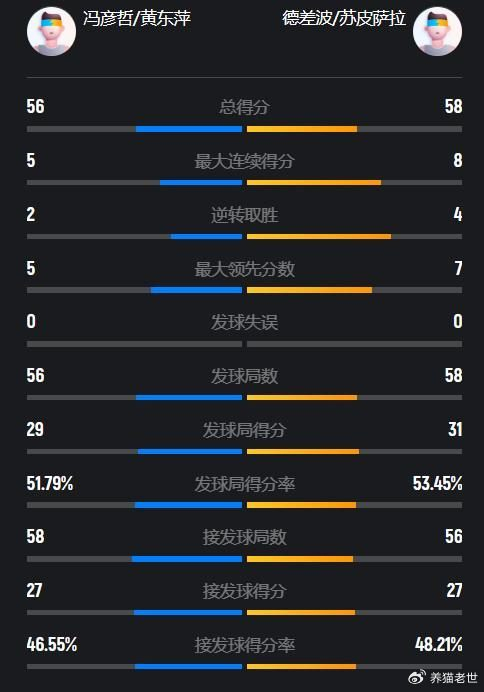 和凤凰组合一样都是以老带新的德差波/苏皮萨拉,在一起搭档征战世界大赛后,进步非常神速,目前世界排名高居第四,冯彦哲/黄东萍对于德差波/苏皮萨拉也不陌生,双方上赛季一共有过5次直接对话,凤凰组合3胜2负略占上风,其中最近的两次直接对话,都是他们笑到了最后。